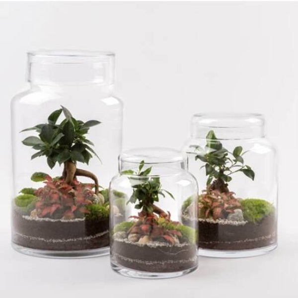 Terrarium FLAT LARGE The Flat Large is a large terrarium; its cylindrical container and flat lid are made of glass. It houses a ficus retusa as the main plant, several side plants, mosses, gravel & soil. Dimensions: H 38 cm x D 25 cm