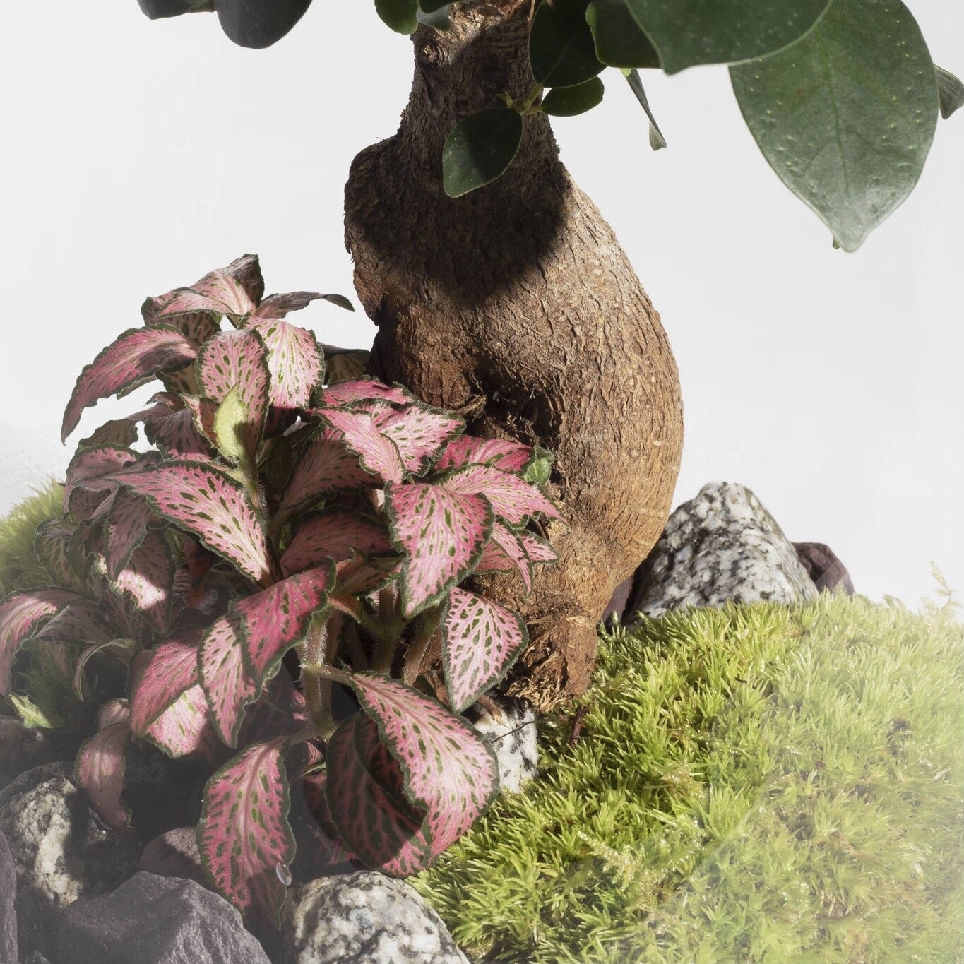 Terrarium PRAIRE The Prairie Large is a medium to large terrarium with a cylindrical container and apothecary style lid made of glass. It houses a ficus retusa as main plant, several side plants, mosses, gravel & soil. Dimensions: H 44 cm x D 19 cm