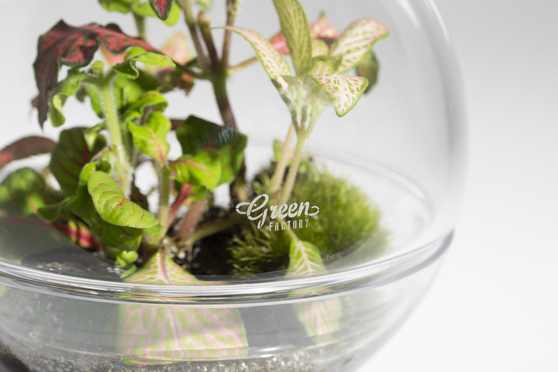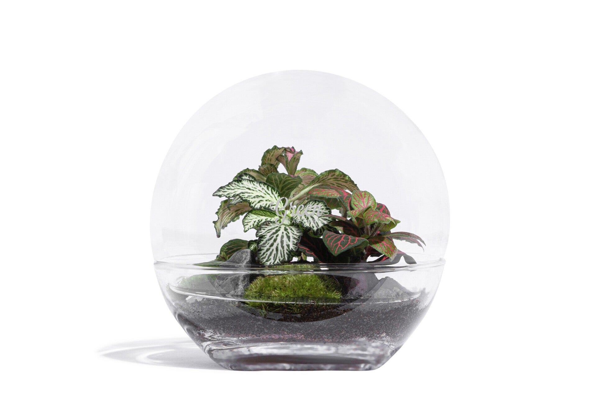 The Forest Moon Small is the smallest terrarium of the Moon family; its base and bell are made of glass and round in shape. The FMS houses a bouquet of fittonias of different colours as well as moss, gravel & soil.