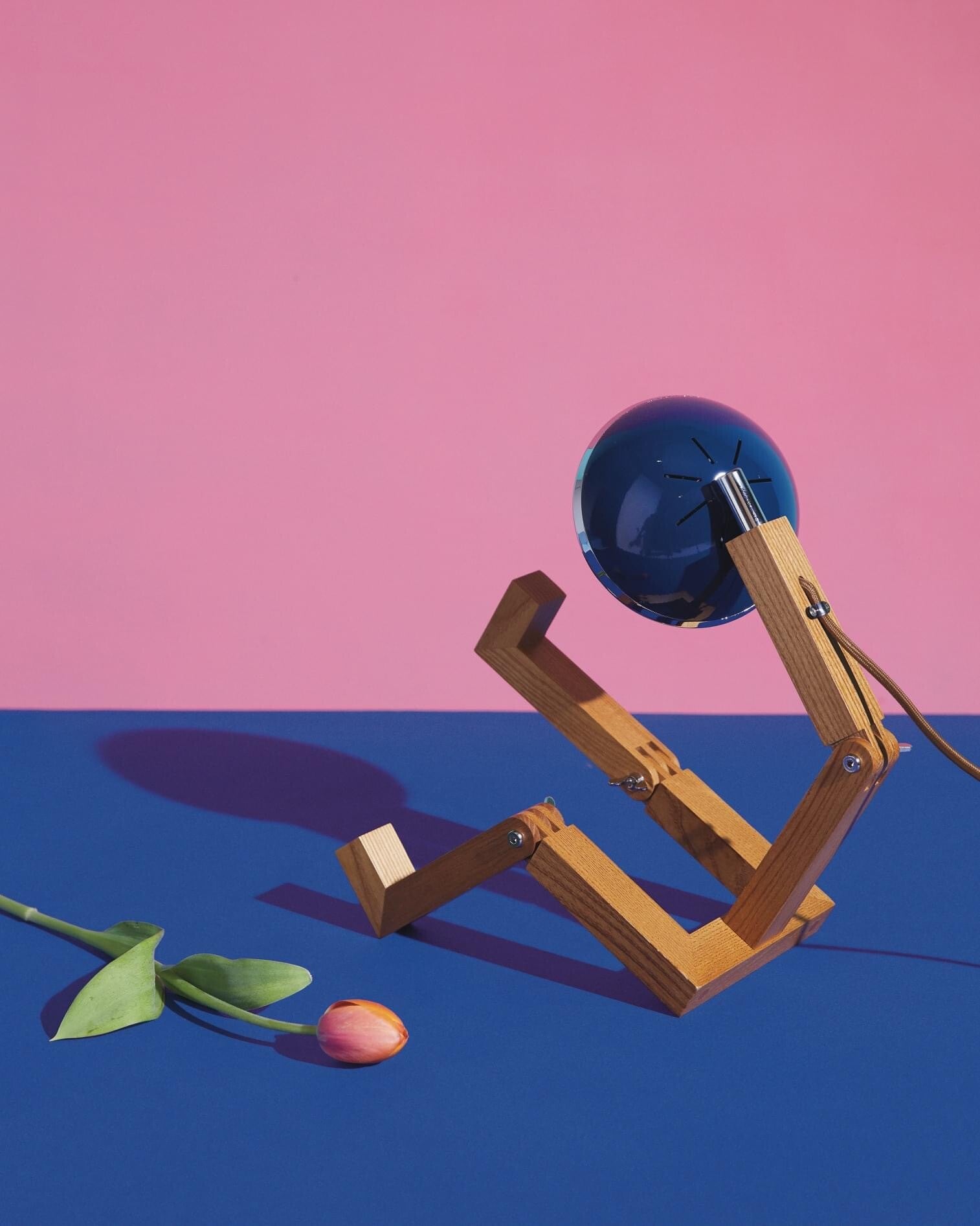 BLUE Material: Ash Wood | Aluminum | Metal Dimensions: W155 x D276 x H180 ~ 400mm Bulb: 3W G4 LED (incl.) Cable: 2,3M Cotton Brown
